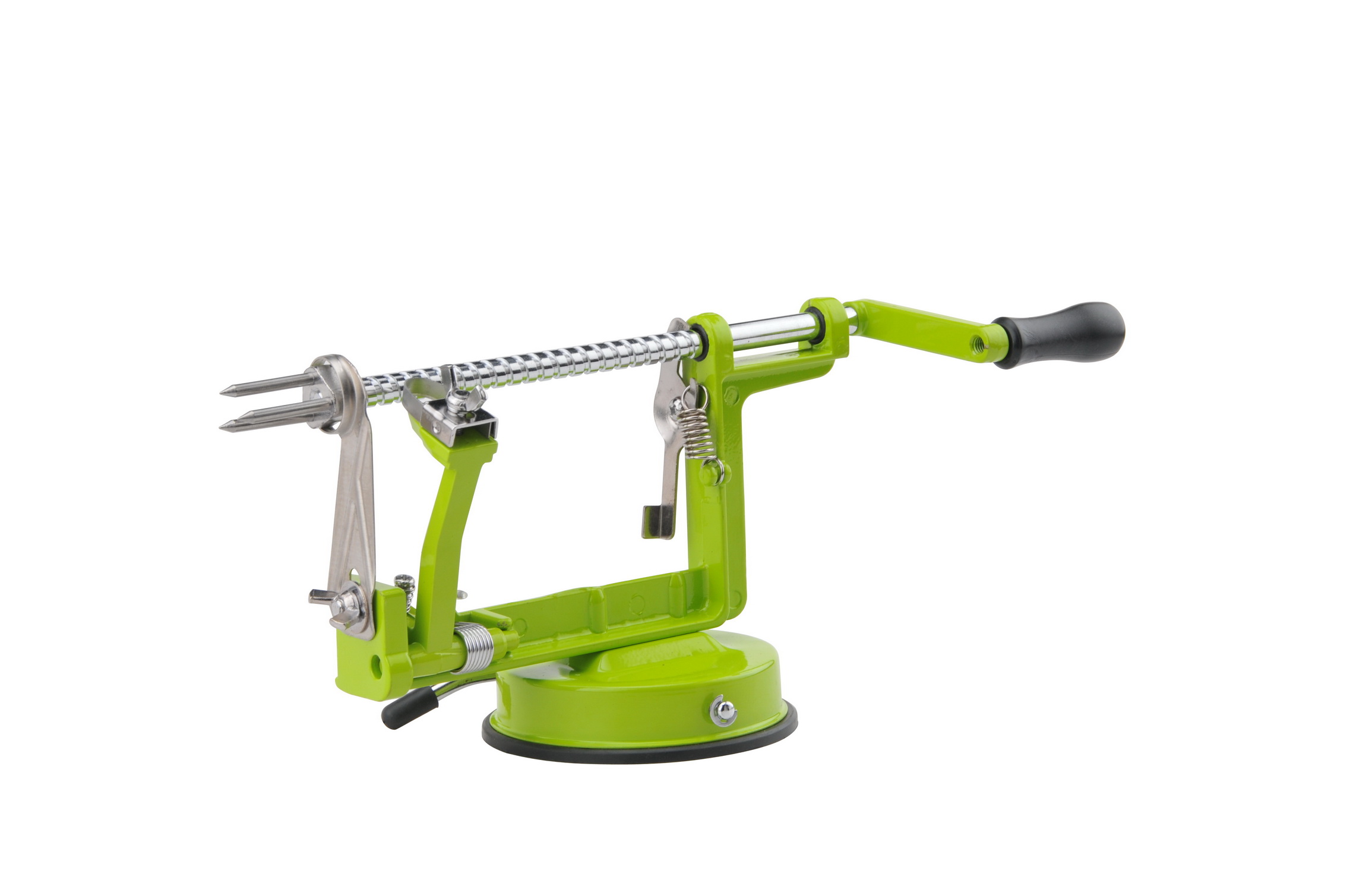 There has never been such an efficient Peeler! It does not only skins the apple but also remove the core and slices it up.It features stay-sharp stainless steel baldes and a vacuum base that holds to any smooth surface. The frame is made of heavy duty, durable cast aluminumor zinc, yet remains light weight, but can be used for years.
