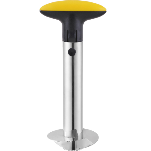 1.Slice off the crown of the pineapple.place the pineapple cutter in the middle of the pineapple,with the serrated edge placed over the core.